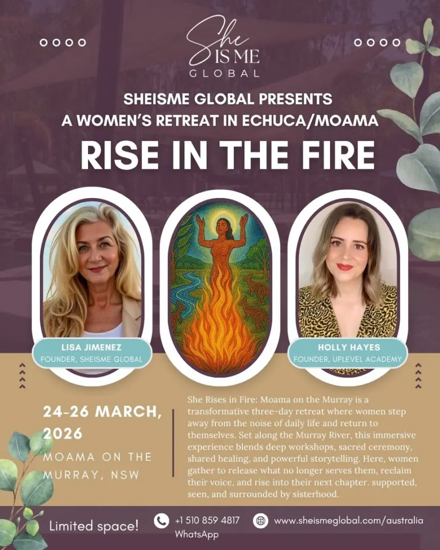 Friday 24 Apr 2026 "Rise In The Fire" Women's RetreatStep into your power at Rise in the Fire. Let go of what holds you back and rediscover who you are.Tickets: sheismeglobal.com/australia